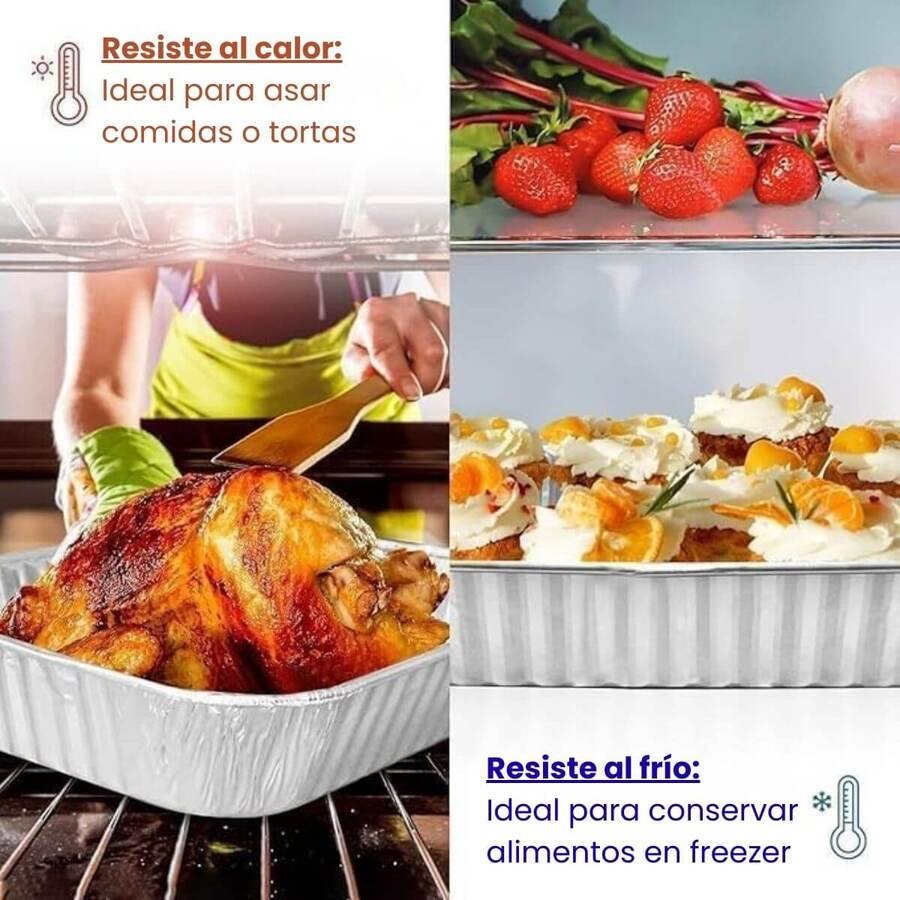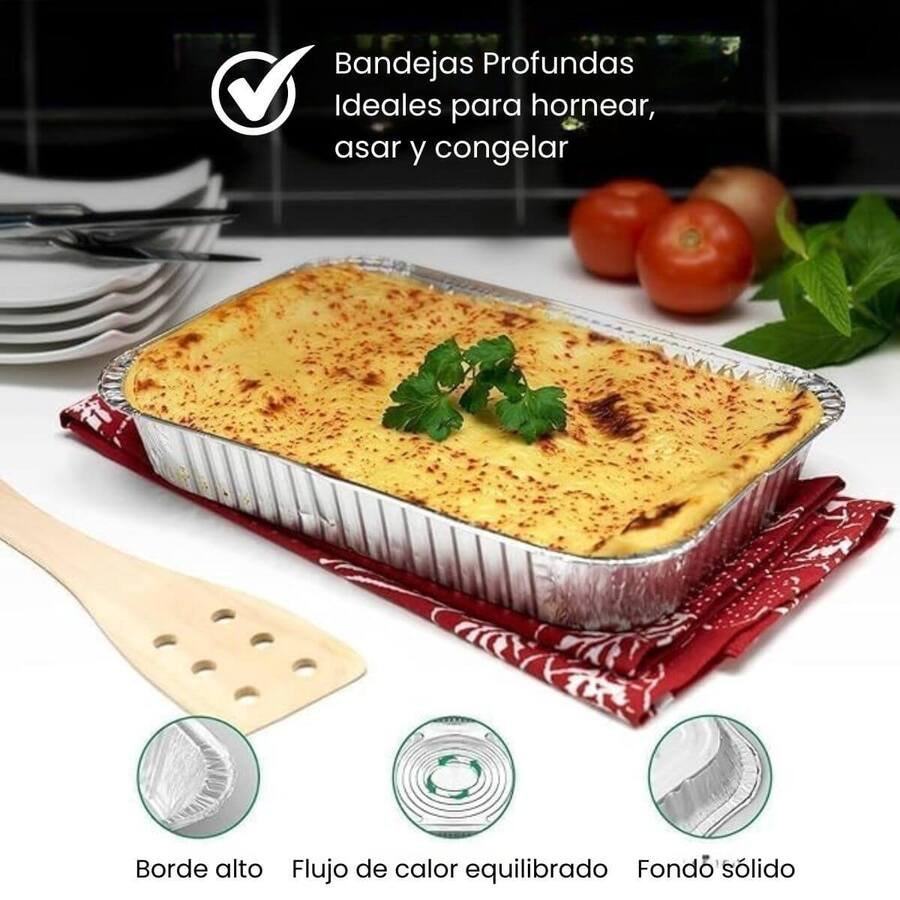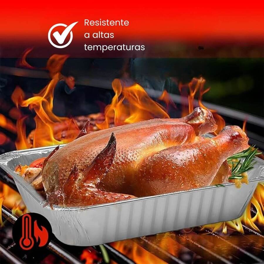 Fabricada en aluminio de alta resistencia, permite su uso en horno convencional y soporta temperaturas elevadas sin deformarse. Es muy utilizada en rotiserías, catering, eventos y delivery, ya que facilita el servicio y evita el uso de recipientes reutilizables.