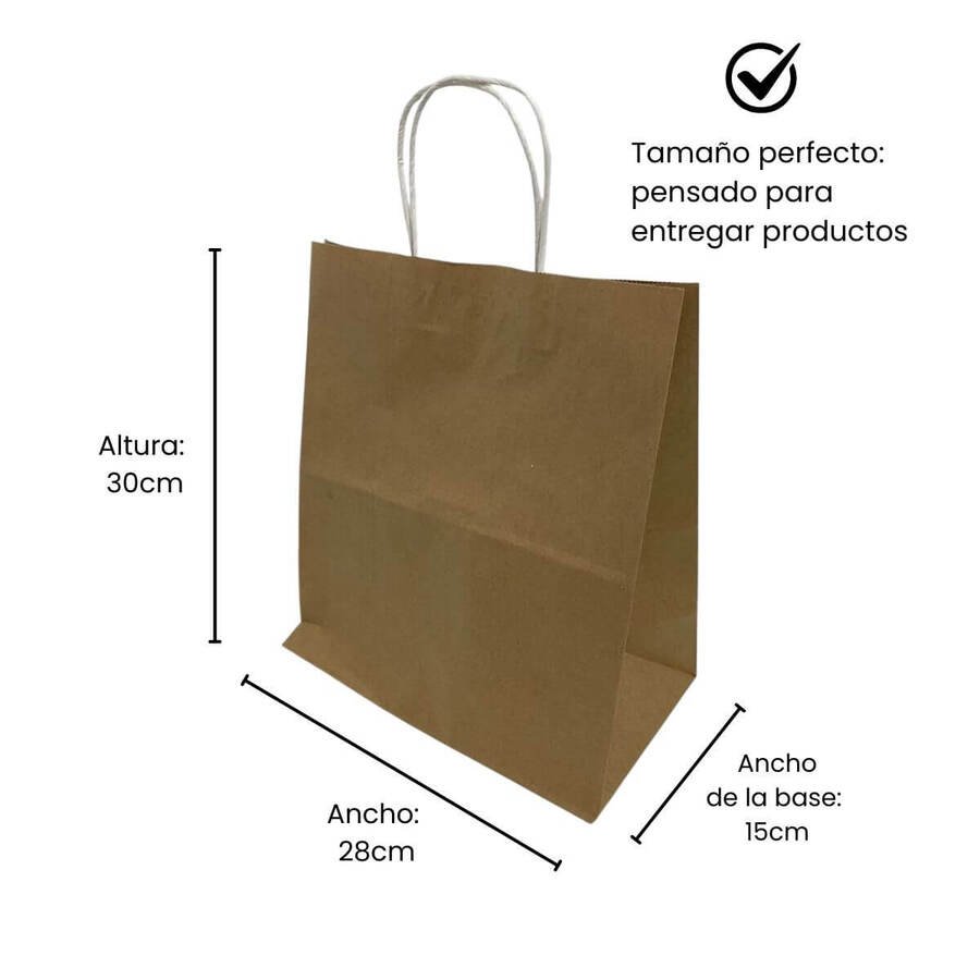 La bolsa de papel kraft 28 x 30 x 15 cm con asas es ideal para el empaque y la entrega de productos en comercios y emprendimientos, ofreciendo una solución resistente y con excelente capacidad.