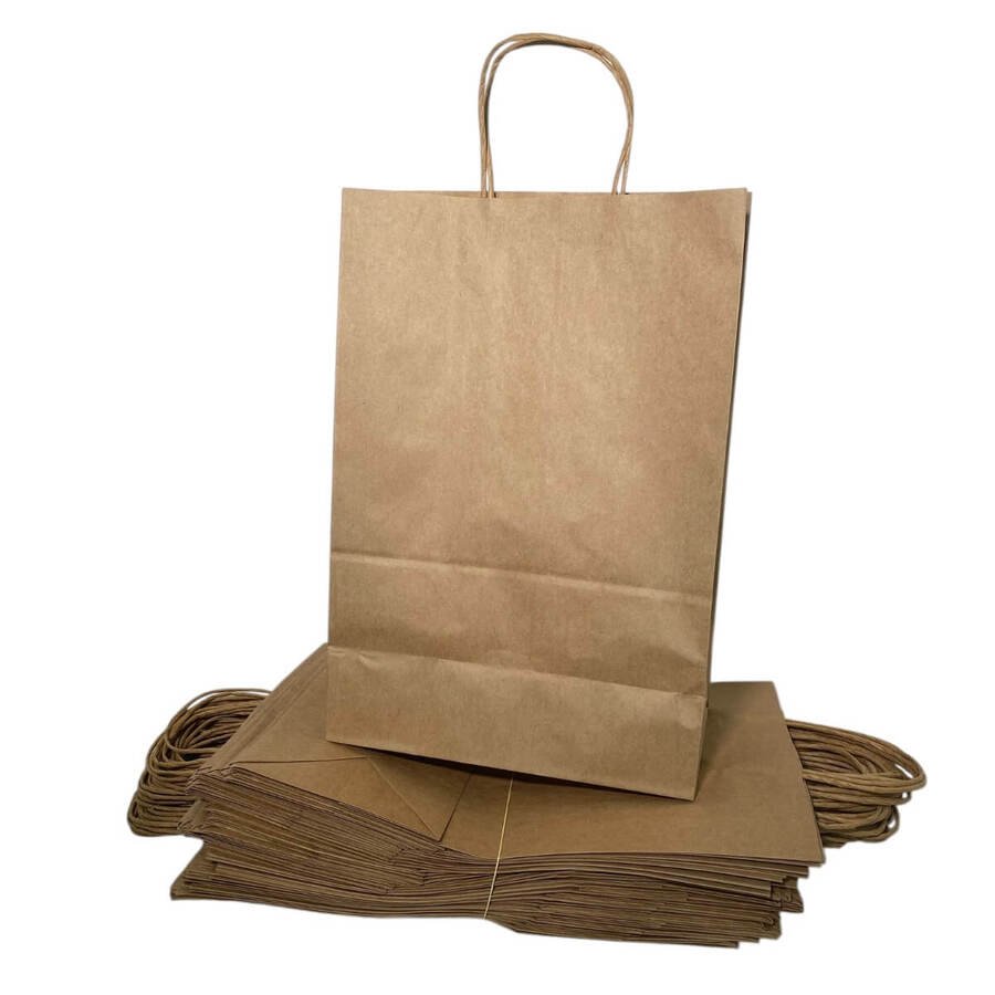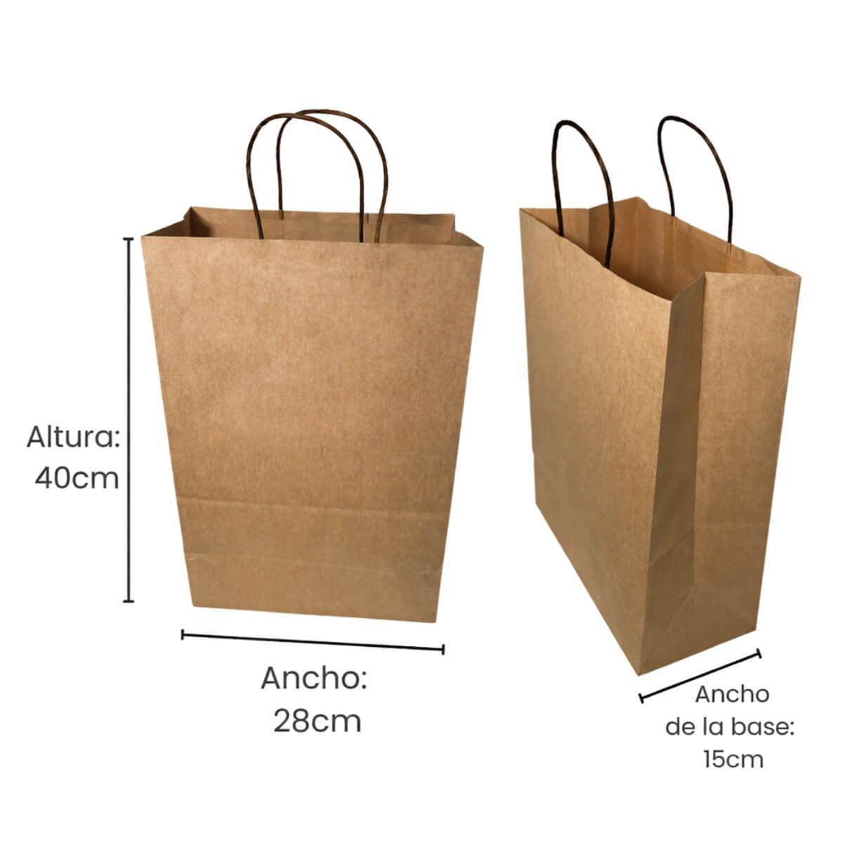La bolsa de papel kraft 28 x 40 x 15 cm con asas es ideal para el empaque y la entrega de productos de mayor tamaño, ofreciendo resistencia, buena capacidad y una presentación profesional.