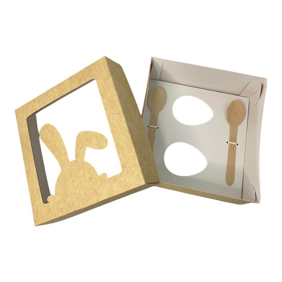 Pack de 10 Cajas para 2 Huevos de pascua con visor y cucharas de Madera – Diseño Conejo
