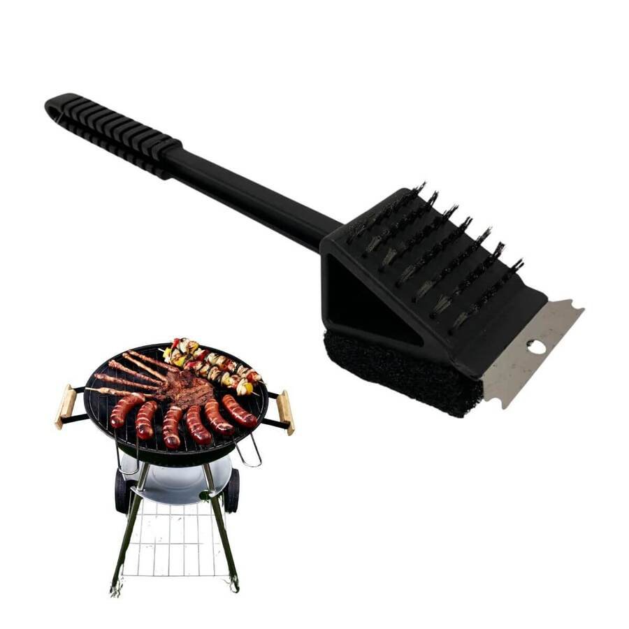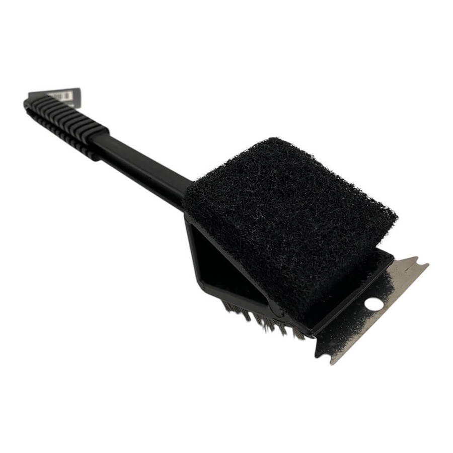 -3 funciones en 1: Cepillo de cerdas metálicas, raspador y esponja abrasiva.