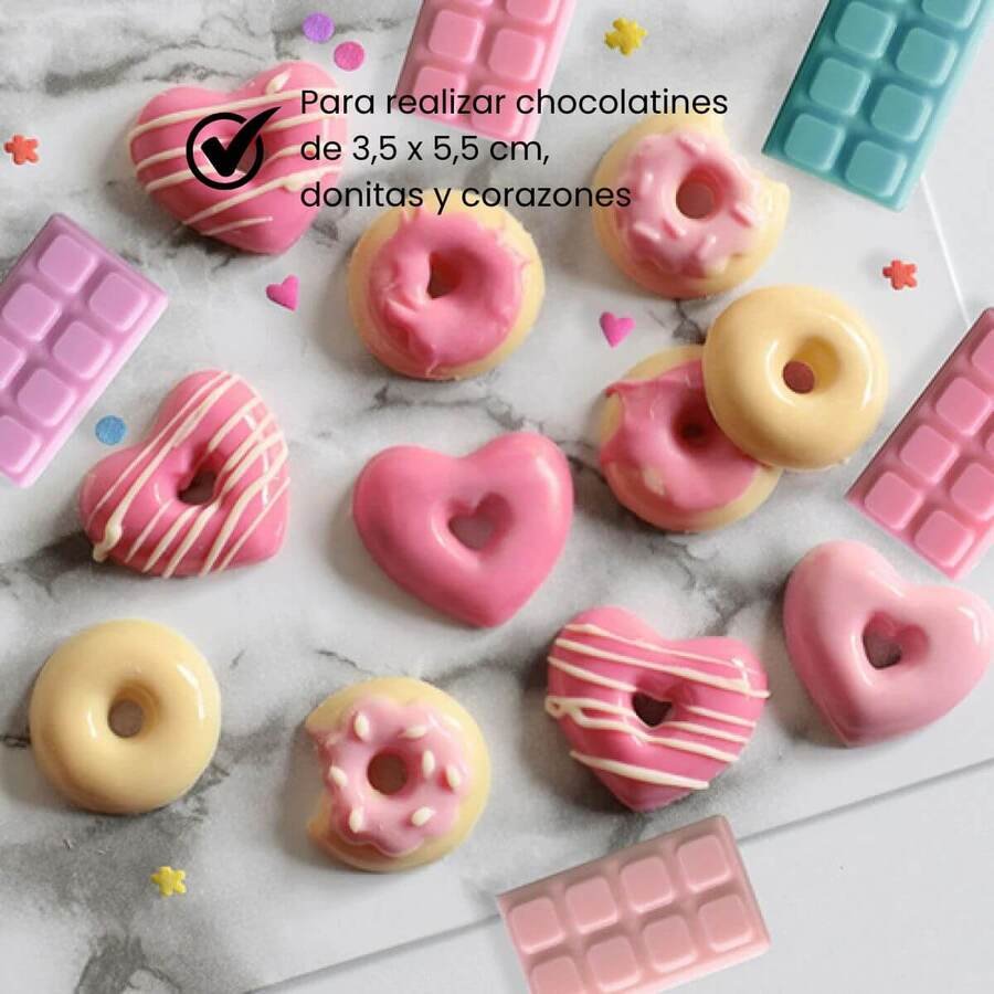 Set compuesto de 2 moldes placas acetato para realizar chocolatines de 3,5 x 5,5 cm, donitas y corazones.