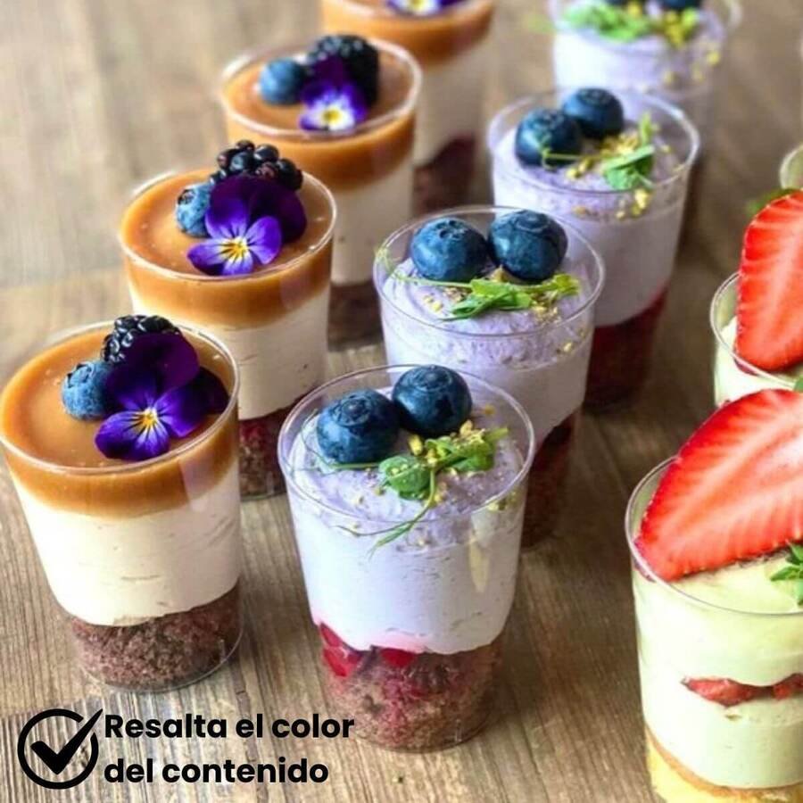 Fabricado en plástico transparente con diseño tipo cristal, es muy utilizado en pastelerías, eventos, catering y emprendimientos gastronómicos para servir mousses, tiramisú, cheesecake, shots dulces o salados.